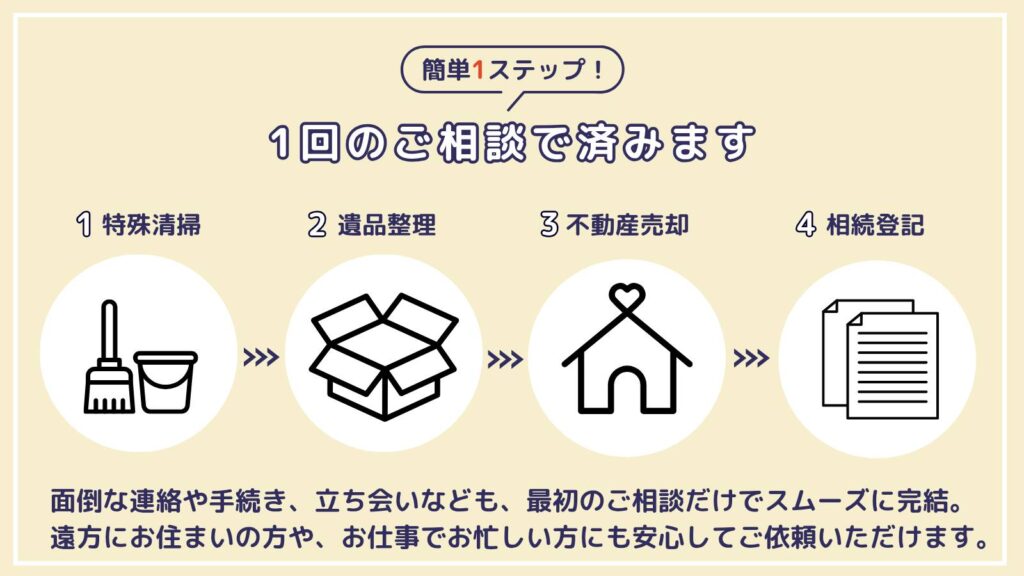 遺品整理・特殊清掃・不動産売却までワンストップで対応いたします。